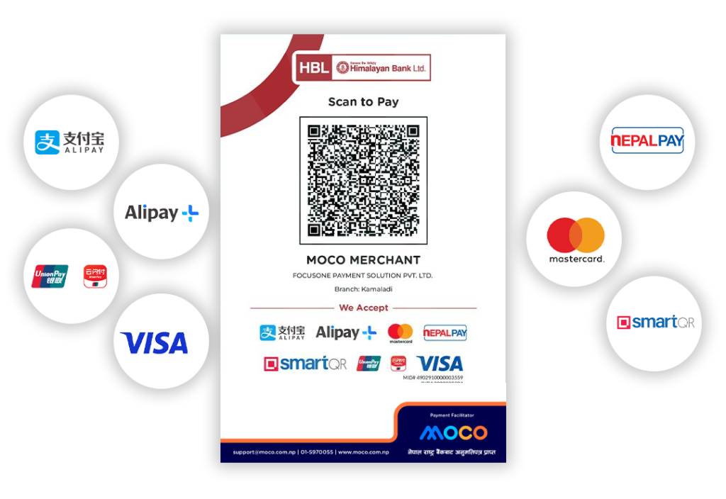 Effortlessly accept a wide range of payment networks with MOCO Unified QR code. Nepal’s first unified QR code that accepts payments from international and national networks, including Alipay+, Mastercard, NEPALPAY, SmartQR, UnionPay International, and Visa.